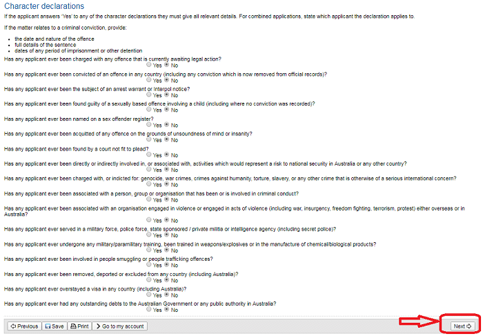 هنا أيضا سيكون عليك كمقدم الطلب الإجابة “بنعم أم لا ” على الأسئلة المتعلقة بحسن السيرة.