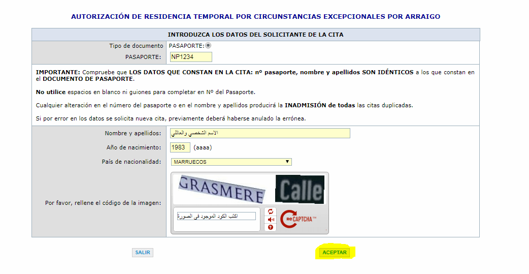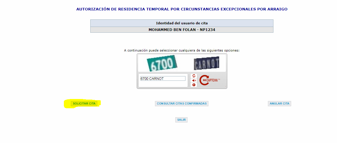 بعد ذلك ستظهر لك صفحة أخرى يطهر فيها اسمك ورقم جواز سفرك ، حيث يجب أن تدخل الكود الذي سيظهر لك ثم تضغط على SOLICITAR CITA