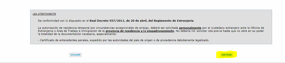 هذا كل ماهو مطلوب منك في الإستمارة ، بعد ذلك تعود الى الموقع الذي بدأت منه تضغط على الزر ENTRAR ستجده في نهاية الصفحة كما هو موضح في الصورة